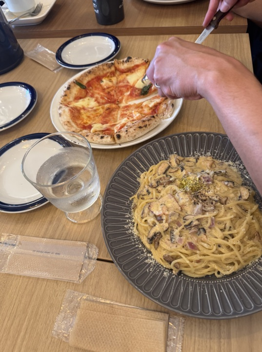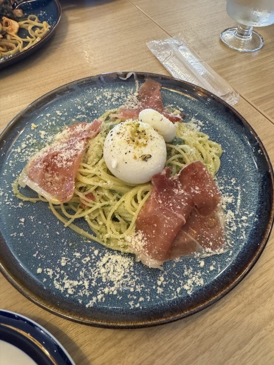 今回は、生ハムとチーズのバジルソースのパスタをいただきました!!